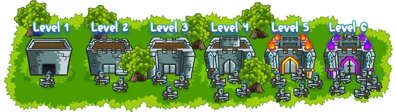 Each tower has 6 upgrade levels, the higher the level, the stronger the warriors and the more gold you knock out of enemies.
